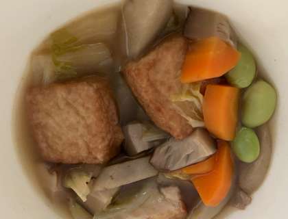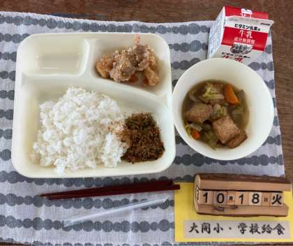 鶏肉のたつたあげ、あつあげと野菜の煮もの、おかかなっ葉、ご飯、牛乳です。
