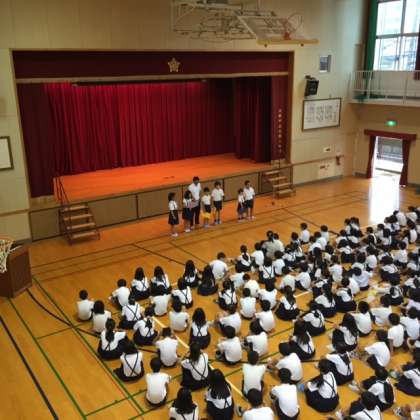 校長先生の話、生活指導部長の話、また、代表の児童が、1学期の振り返りと、2学期への豊富をみんなの前で話しました。