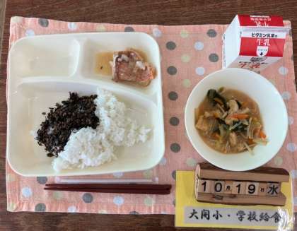 あかうおのみぞれかけ、みそ汁、牛ひじきそぼろ、ご飯、牛乳です。