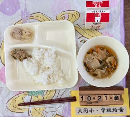 鶏肉のゆず塩焼き、ソーキ汁、ツナ大豆そぼろ、ご飯、牛乳です。