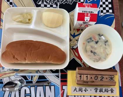 きのこのクリームシチュー、キャベツのピクルス、りんご、こくとうパン、牛乳です。
