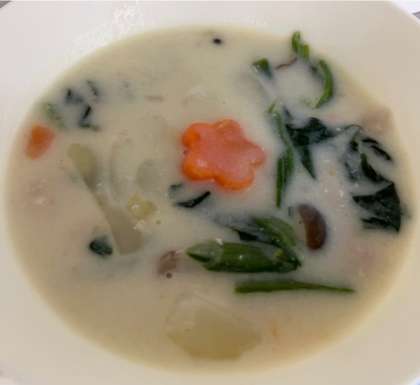 きのこのクリームシチューは、鶏肉をいためます。更に、にんじん、たまねぎの順にいため、じゃがいも、湯を加えて煮ています。別釜に油を加え、弱火で小麦粉が色づかないように十分いためてルウをつくります。じゃがいもが半ば柔らかくなれば、しめじ、エリンギ、マッシュルーム、ルウを加え、塩、こしょうで味つけして煮込んで、最後に牛乳、クリーム、ほうれんそうを加えて煮ています。