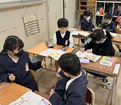 算数科の学習で陣取り遊びをしました。じゃんけんをして勝ったらひとマスぬり、広さを比べることを学習します。活動を通して量的な感覚を育てることができました。