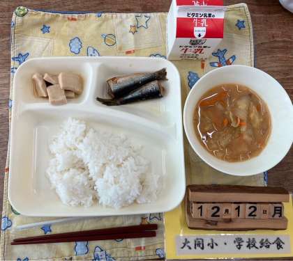 いわしのしょうが煮、みそ汁、高野どうふの煮もの、ご飯、牛乳です。