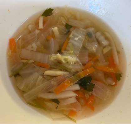 こまつなの煮びたしは、だしこんぶ、けずりぶしでだしをとり、鶏肉を加えて煮ています。砂糖、うす口しょうゆ、濃い口しょうゆで味つけし、湯がいたこまつなを加えて煮ています。