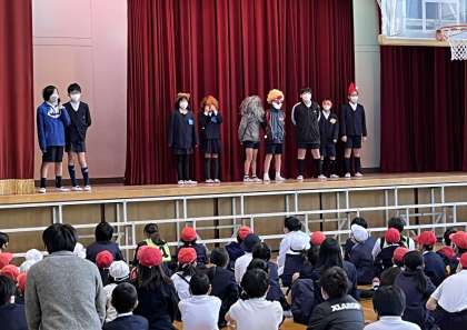 2学期最後の集会を行いました。「カーテンの後ろにいるのは何人だ?」ゲームをしました。なかなか難しい問題に、児童は話し合いながら全問正解を目指していました。