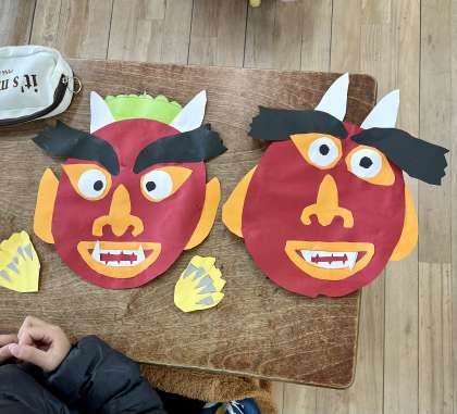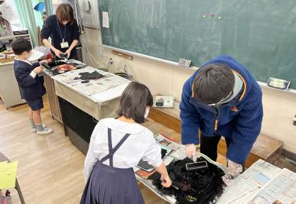 図画工作で、版画をしました。最初は鬼のお面のように飾っていたのですが、インクをつけて紙に写すと、鬼の版画ができ上がりました。