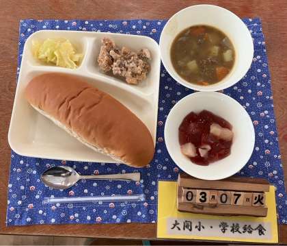 フライドチキン、カレーシチュー(米粉)、キャベツとコーンのサラダ、フルーツゼリー、こくとうパン、牛乳です。