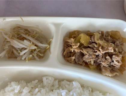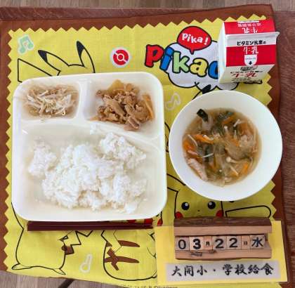 豚肉のコチジャンいため、豚肉とはるさめのスープ、もやしのナムル、ご飯、牛乳です。