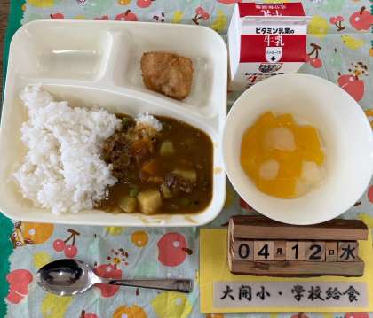 カツカレーライス、フルーツゼリー、ご飯、牛乳です。