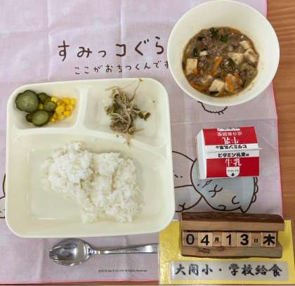 マーボーどうふ、きゅうりとコーンの甘酢あえ、もやしとピーマンのごまいため、ご飯、牛乳です。