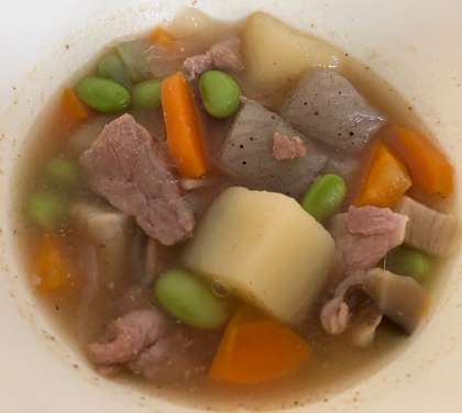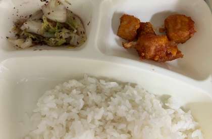 まぐろのオーロラ煮、豚肉と野菜の煮もの、キャベツの赤じそあえ、ご飯、牛乳です。
