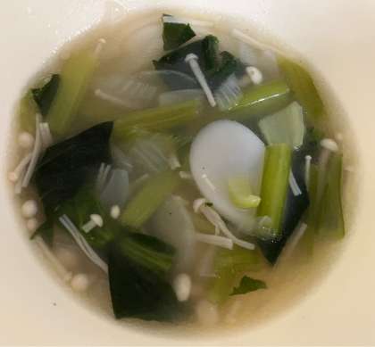トックは、湯をわかし、玉ねぎを加えて煮る。煮上がれば、トック、えのきだけを加えて煮、塩、こしょう、うすくちしょうゆ、中華スープの素で味付けして小松菜を加えて煮ています。