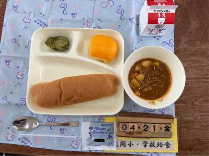 ビーフシチュー、きゅうりのサラダ、あまなつかん、ブルーベリージャム、コッペパン、牛乳です。
