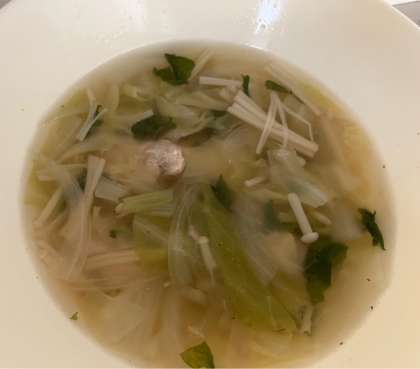 すまし汁は、こんぶ、けずりぶしでだしをとり、鶏肉、たまねぎ、キャベツの順に加えて煮ています。煮上がれば、えのきたけを加えて煮、塩、うすくちしょうゆで味つけし、最後にだいこん葉を加えて煮ています。