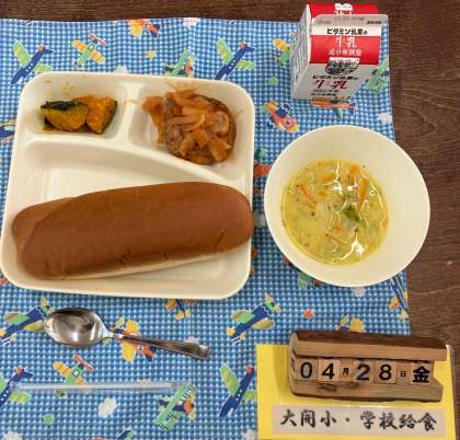 煮こみハンバーグ、コーンとキャベツのスープ、焼きかぼちゃ、こくとうパン、牛乳です。