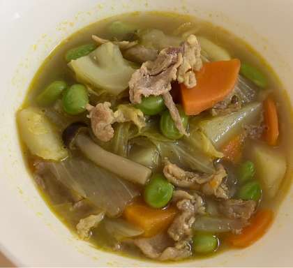 豚肉と野菜のカレースープ煮は、油を熱し、豚肉をいためます。更に、にんじん、たまねぎ、キャベツの順にいため、じゃがいも、湯を加えて煮ます。しめじを加えて煮、砂糖、塩、こしょう、カレー粉、ウスターソース、こいくちしょうゆ、チキンブイヨンで味つけし、最後にむきえだまめを加えて煮ています。
