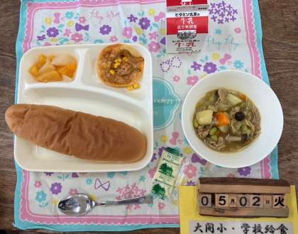 豚肉と野菜のカレースープ煮、変わりピザ、ミックスフルーツ(缶)、コッペパン、ソフトマーガリンです。