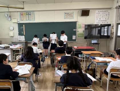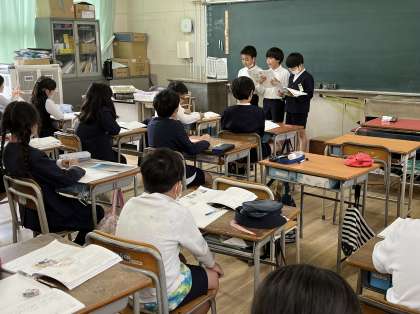 国語で物語の音読発表会をしました。班ごとに場面を分担し、工夫をして音読しました。