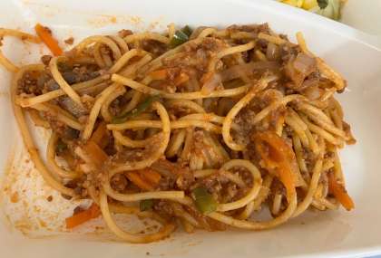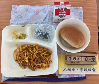 ミートスパゲッティ、レタスとコーンのサラダ、ミニフィッシュ、こくとうパン(2分の1)、牛乳です。