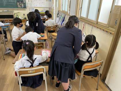 6年生が低学年のお世話をしています。高学年としての自覚が芽生えていきます。