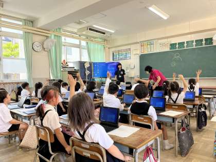 学級活動で、一人一台端末を使いました。大型モニターによる説明を聞きながら、自分でログインすることができました。