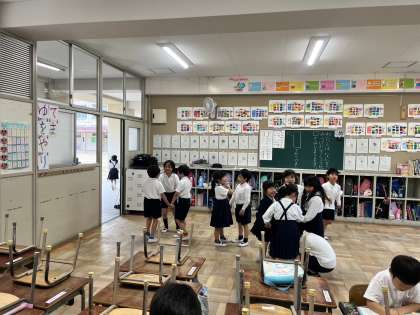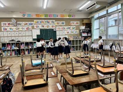 生憎の雨で運動場で遊べませんが、教室内でわらべうたを歌いながら体を動かし、リズム遊びをしていました。