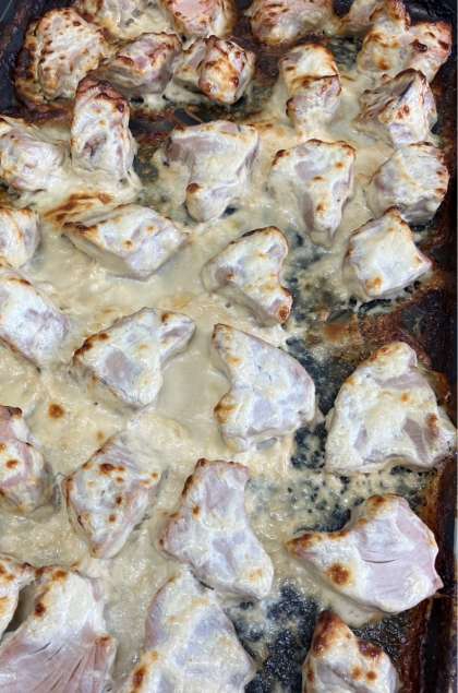 かつおのマリネ焼きは、かつおは塩、こしょう、ノンエッグドレッシングを合わせて下味をつけ、焼き物機で焼いています。