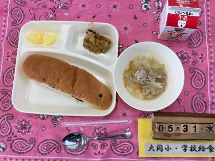 カレードリア、豚肉とキャベツのスープ、りんご(カット缶)、レーズンパン、牛乳です。
