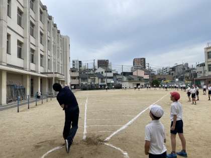 全校でスポーツテストに取り組んでいます。ソフトボール投げの計測をしました。