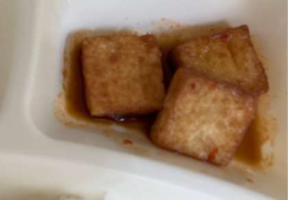 あつあげのピリ辛じょうゆかけは、あつあげはホテルパンで焼きます。砂糖、こいくちしょうゆ、トウバンジャンを合わせて煮、配缶時にあつあげにかけます。