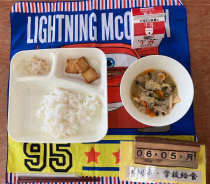 あつあげのピリ辛じょうゆかけ、もやしの中華あえ、ご飯、牛乳です。