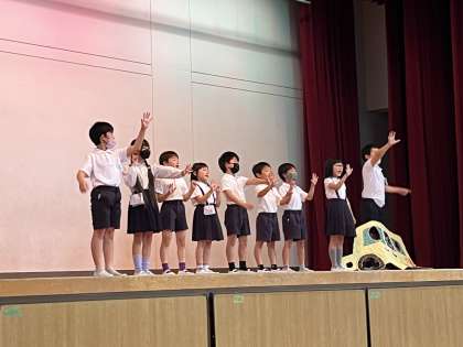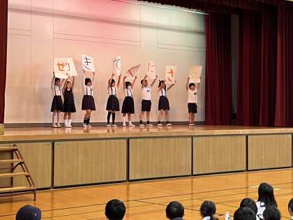 児童集会の時間に、それぞれのお店のCMを発表しました。くふうを凝らして、お店の良さを
