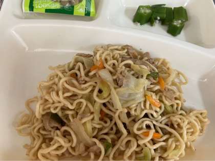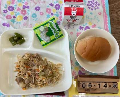 和風焼きそば、オクラの甘酢あえ、まっ茶大豆、こくとうパン(2分の1)、牛乳です。