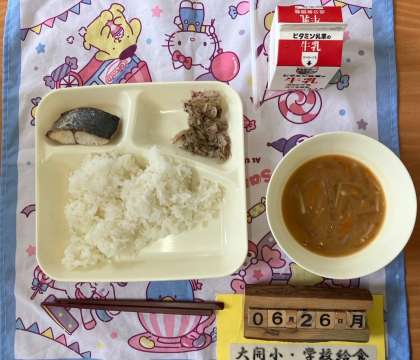 さごしのつけ焼き、みそ汁、キャベツの赤じそあえ、ご飯、牛乳です。