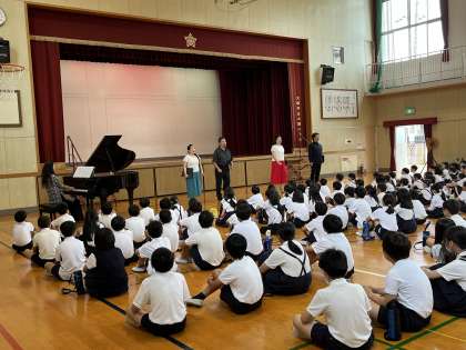 「文化芸術による子ども育成事業」により、関西二期会のみなさんが来てくださり、体のほぐし方や発声方法を教えていただきました。最後のミニコンサートでは、講師の方々の歌声に聴き入っていました。