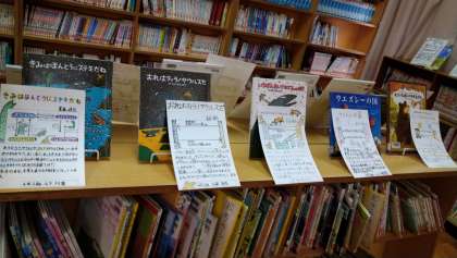 6年生が国語科の学習で作った本の紹介カードが図書室に展示されています。人物関係図など、物語の内容がよく分かるように書かれているので、他の学年の児童もカードを良く読んで本を選んでいます。