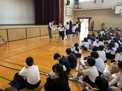 児童朝会で人権標語の表彰を行いました。夏休みに考えた標語を校内で選び、努力賞、優秀賞、最優秀賞がきまりました。最優秀賞に選ばれた作品は校内に掲示されています。
