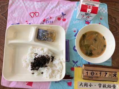 さごしのみぞれかけ、みそ汁、牛ひじきそぼろ、ご飯、牛乳です。