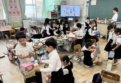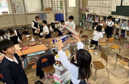 今日からかたちについての単元に入りました。みんながお家から持ち寄った色々な箱を使って、かたち遊びをしました。
