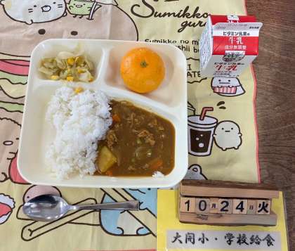 ポークカレーライス(米粉)、サワーソテー、みかん、ご飯、牛乳です。