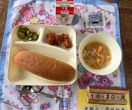 まぐろのオーロラ煮、スープ、きゅうりとコーンのサラダ、ブルーベリージャム、コッペパンです。