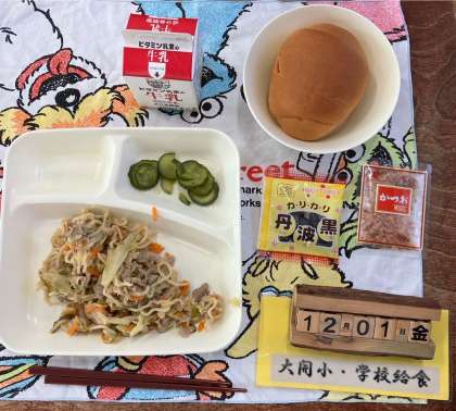 和風焼きそば、きゅうりのしょうがづけ、いり黒豆、こくとうパン(2分の1)、牛乳です。