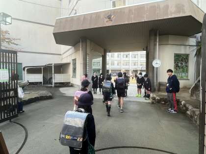 児童会が朝の正門に立ち、登校して来る児童にあいさつを呼びかけています。