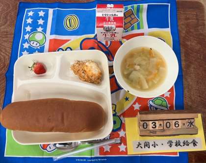 とうふのミートグラタン、じゃがいもと野菜のスープ、いちご、コッペパン、牛乳です。