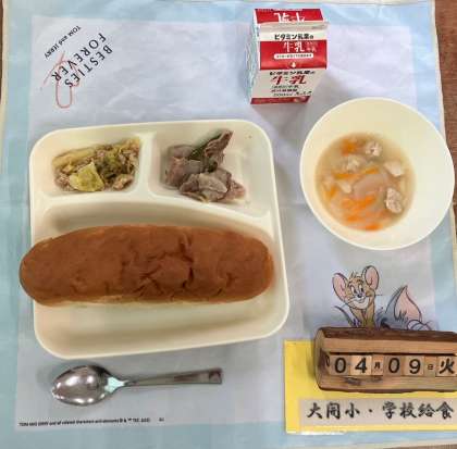 豚肉のガーリック焼き、スープ、ツナとキャベツのソテー、おさつパン、牛乳です。