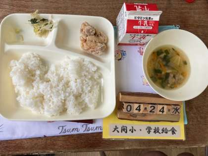 鶏肉のからあげ、中華スープ、チンゲンサイともやしの甘酢あえ、ごはん、牛乳です。