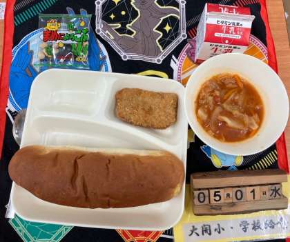 一口トンカツ、ミネストローネ、豆こんぶ、おさつパン、牛乳です。