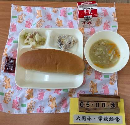 かつおのガーリックマリネ焼き、押麦のスープ、キャベツとベーコンのソテー、コッペパン、いちごジャム、牛乳です。
