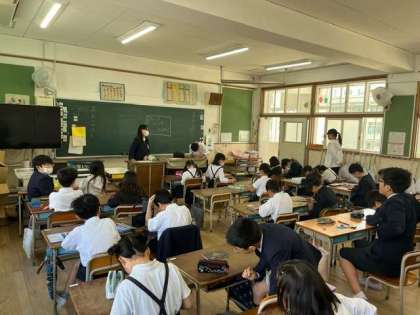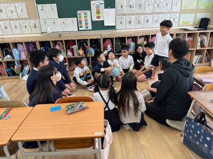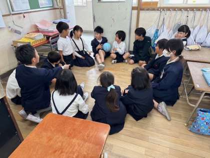 自己紹介やにこにこ班の名札作り、ゲームをして交流しました。